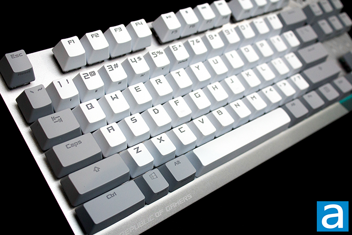 The ASUS ROG Strix Scope NX TKL Moonlight White comes with a standard TKL QWERTY ANSI layout for the most part. In this case, the ROG Strix Scope NX TKL Moonlight White has 84 keys, as it removes the previously stated keys of Print Screen, Scroll Lock, and Pause. The TKL or 80% layout typically has 87 keys, saving space on your desk by removing the numeric keypad. The QWERTY ANSI layout is the standard American layout, which uses the single row Enter key, as seen in some of the previous images. The keyboard does not use a standard bottom row, meaning that some of the keys in this row are bigger or smaller. The changes are on the left side of the keyboard. For those who do not know, 1U stands for a single unit, meaning a 1.25U keycap is 1.25 times wider than a regular one. As such, the left Ctrl is the same size as the left Shift key, being 2.25U. The Windows key is 1U, being the same size as the majority of the keys. The rest of the bottom keys, excluding the space bar, are 1.25U, as per a standard bottom row. To fit the wider Ctrl key, the space bar was reduced to 5.5U compared to the standard 6.25U. According to ASUS, the long Ctrl key is a gaming feature to make it easier to press, since it is often used in gaming as an action like crouch. A beneficial side effect of this change is that the Windows key is smaller, which is a key many users want to avoid pressing in-game. Of course, you can also lock the Windows key, preventing accidental presses entirely.