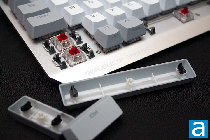 The ASUS ROG Strix Scope NX TKL Moonlight White features their very own ROG NX switches. For our review unit, we were provided with some ROG NX Red switches. This can be considered a Cherry MX Red clone, but there are some subtle differences. These linear switches have a key travel of 4mm and an actuation point at 1.8mm. The total force required to actuate is roughly 55cN. Even with these specifications, it is quite hard to picture what these switches actually feel like, so I will try my best to explain. As this is a linear design, you will feel no bump as the travel will be quite smooth. For a stock switch, the ROG NX Reds are more than acceptable and with a good amount of break in time, they should become smoother. With that said, the ROG NX Reds are not just a knock off of Cherry MX Reds, but they are their very own unique switch with unique characteristics. As neither is better than the other, it all comes down to preference in what switch you will want. I will talk more in depth about the typing experience later into this review.