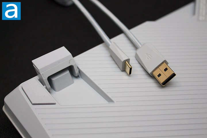 Taking a peek at the bottom of the keyboard, we have five rubber feet and two more on the flip-out feet. The feet on the bottom side are quite large, doing an excellent job of keeping the keyboard in place. There should be no noticeable unintentional sliding. There is no cable raceway to manage the cable on the bottom, but it is not a feature I find myself commonly using. The addition would have been nice, but not necessary. The cable plugs in at the bottom using a USB Type-C Interface. This is a good thing as this has become the standard.