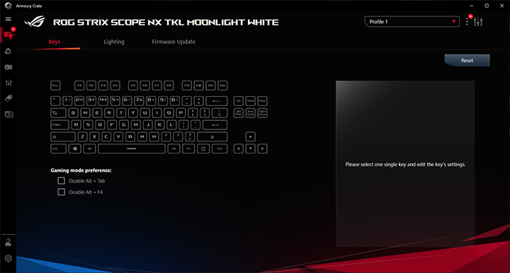 Many of ASUS’ products, including their keyboards, mice, mousing surfaces, headsets, headset stands, NVIDIA Ampere GPUs, monitors, motherboards, and even full ASUS computers use Armoury Crate for modifying different devices as well as synchronizing their lighting effects. After downloading the 1.48MB compressed file, it immediately recognized my ROG Strix Scope NX TKL Moonlight White. The setup process was quite streamlined and simple. Armoury Crate includes many other features such as AURA Sync, game library, system-wide profiles, game deals, and more news, but I will focus on the configuration pages for the ROG Strix Scope NX TKL Moonlight White for the purpose of this review. I found all of pages to be quite intuitive.