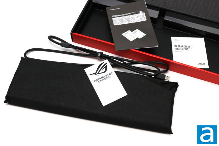 As you can see above, the box contents are pretty straightforward. The ASUS ROG Strix Scope RX can be found in a fabric bag to prevent any surface scratches on the keyboard. Several pieces of documentation are included with the keyboard, including a quick start guide, and some warranty information. Finally, there is a pair of Republic of Gamers stickers in black and gray so that you can stick these where you would like. Otherwise, let us take a closer look at the keyboard itself.