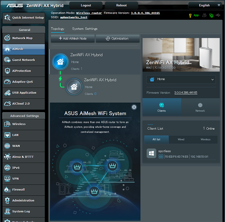 After Network Map is AiMesh for adding ZenWiFi AX Hybrid nodes or compatible ASUS routers to form a mesh network system. AiMesh supports both wireless, Ethernet, and power line backhaul, which the user can configure. Devices can be blocked from roaming between nodes.