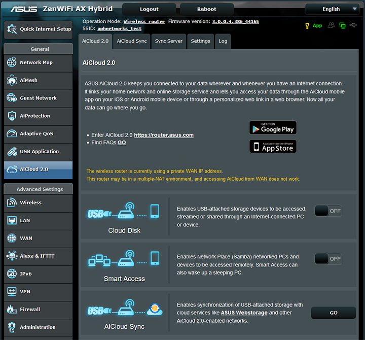 The next section, USB Application, is where you can configure apps like AiDisk, Servers Center, Network Printer Server, 3G/4G, Time Machine, and Download Master to work with the connected USB device. This depends on whether you have a USB flash drive, cellular dongle, or printer connected, of course. The above screenshot shows the AiCloud 2.0 configuration screen. AiCloud allows you to create your own private cloud with a connected USB storage device.