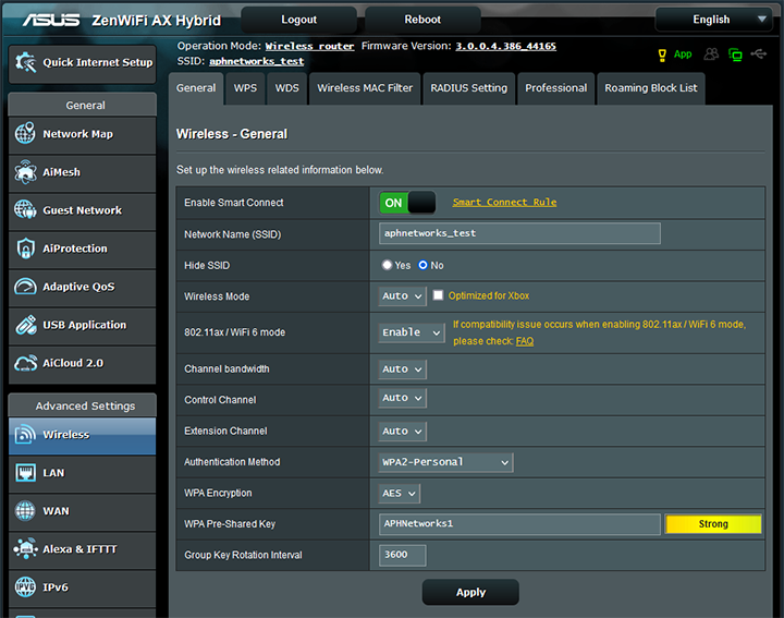 The Wireless section is where wireless settings are configured. The above screenshot shows all the options for the General tab, where standard Wi-Fi settings such as SSID, wireless mode, encryption settings, and channel settings can be customized. Other tabs include WPS or Wi-Fi Protected Setup, WDS or Wireless Distribution System, Wireless MAC Filter, RADIUS Setting, Professional, and Roaming Block List. Other than Professional, all of them should be self-explanatory.