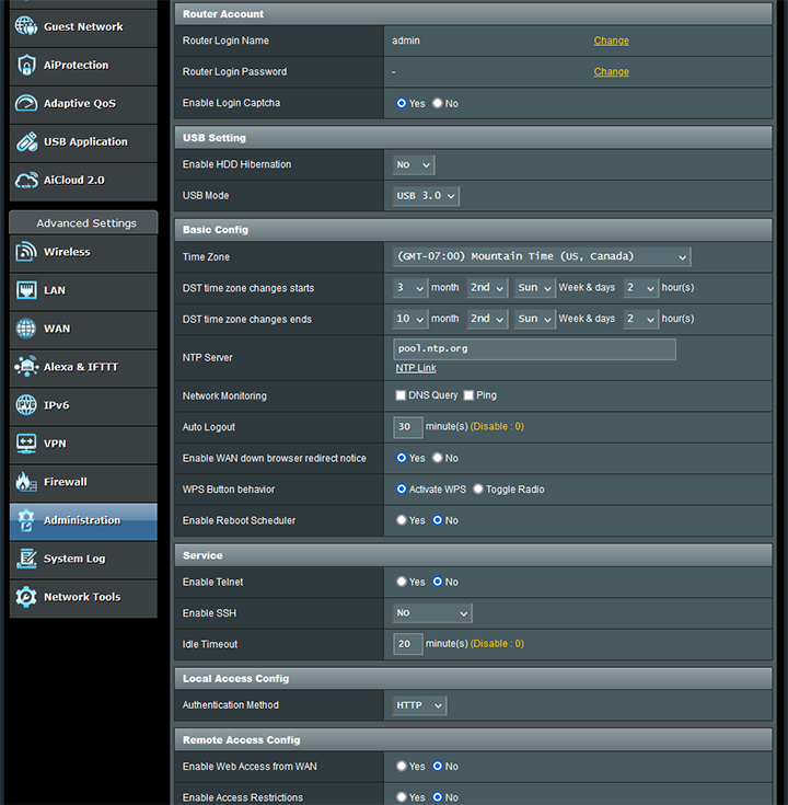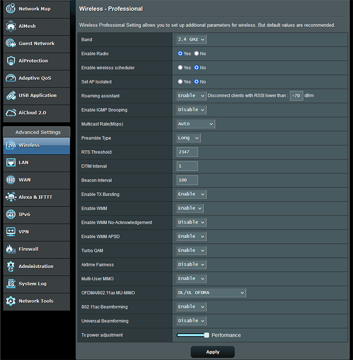 For the nerds among us, the Professional tab under the Wireless section is quite interesting, as shown in the screenshot above. Some of these options include MIMO modulation scheme, transmit power adjustment, explicit beamforming, and universal beamforming. A lot of these options are not commonly found in consumer-grade firmware, so I am happy to see them for those who are inclined to tinker with them.