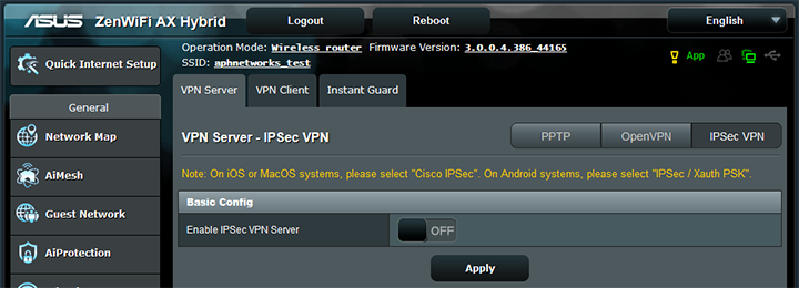 The next section I want to highlight is the VPN section. The VPN section has VPN Server, VPN Client, and Instant Guard tabs. The ZenWiFi AX Hybrid has native support to be PPTP, OpenVPN, and IPSec VPN servers, shown in the above screenshot. VPN Client allows you to connect your entire network to a VPN server on a router level. Instant Guard allows you to monitor who is connected to the VPN server on the router, which can be created using the ASUS Router App.