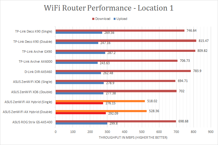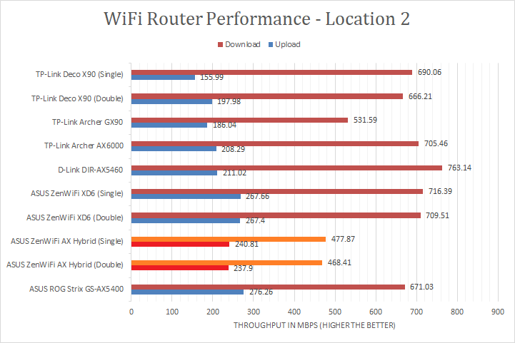 Since wireless channels are generally characterized by path loss, large scale fading, and small-scale fading, the router was tested in six different locations described above to comprehensively measure its true throughput performance. This includes a combination of line of sight and non-light of sight spots, different distance and positions relative to the router, as well as shadowing caused by objects between the laptop and the router. In order to overcome inconsistencies due to small scale fading, a relatively large 500MB test file was used. Furthermore, movement of people and objects within the vicinity of the devices during testing was eliminated whenever possible. As the ASUS ZenWiFi AX Hybrid is a mesh unit, the primary one was in his living room, where the single-unit routers sat, while the second unit was placed in an adjacent room and connected using the HomePlug AV2 power line backhaul. This should allow for better coverage on the other end of his house.