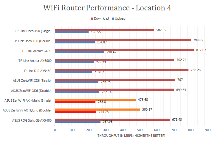 Location 1 is usually where routers demonstrate the maximum upload and download speed. This is part of the test design, as this is the only location with direct line-of-sight, not to mention a very close proximity. In this case, the ASUS ZenWiFi AX Hybrid had very competitive upload speed in both configurations. Its download speed was the slowest among all models, but this was expected for its AX1800 speed rating. Results from Locations 2 and 4, which are almost just above or below the router, respectively, showed the antenna array strength when the laptop is above or below even if it did not have direct line-of-sight. It seems the ZenWiFi AX Hybrid's antenna array suffered minimal losses when you are directly above or below it. As with Location 1, the ZenWiFi AX Hybrid's upload speed in both configurations was consistently strong in Locations 2 and 4 -- scoring well within the ballpark of other tested models -- in our charts. Its download speed was noticeably slower than the competition, but do keep in mind it also has the lowest speed rating.