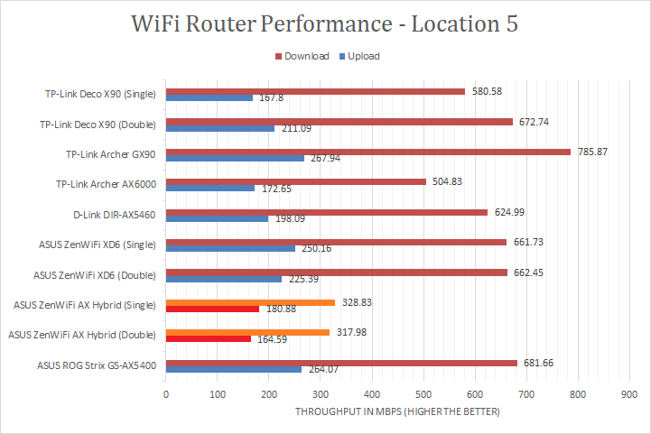 Location 5 is outdoors and separated by a sliding glass door, but is generally still close to the router. Despite the horizontal distance, its speeds remained very competitive. Speaking of which, Locations 3 and 6 are trickier regions, as they are the furthest away from the router and not directly above or below. Location 3 showed reasonably good upload and download speeds, but only in single configuration. In single configuration, the ZenWiFi AX Hybrid had very reasonable losses compared to Location 1 and competitive against other routers on the list considering its speed class. However, in dual configuration, we saw a significant performance loss. This is because the laptop was connected to the second ZenWiFi AX Hybrid, so the second ZenWiFi AX Hybrid was using the power line as backhaul to the main router. This means the overall speed was limited by the HomePlug AV2's 1300Mbps theoretical bandwidth, which in practice was closer to 130Mbps down and 100Mbps up in practice from our tests.