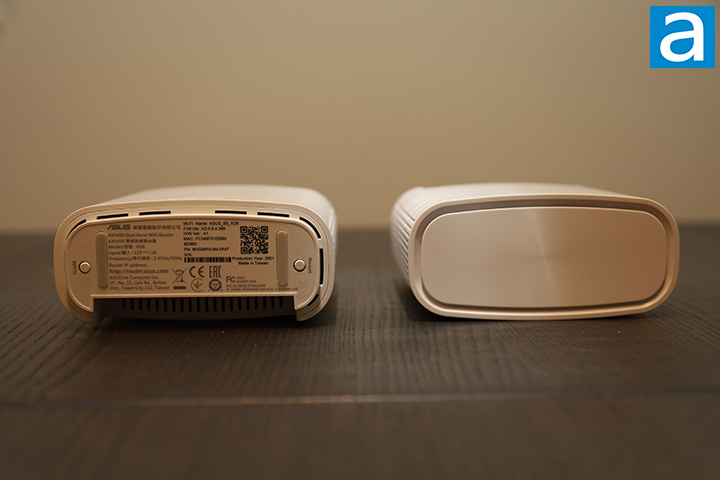 Ventilation openings can be seen at the top and bottom of the ASUS ZenWiFi XD6, where the top is a bit more subtle. A pair of thin rubber feet provide some grip as well as a little bit of extra clearance between the router and your table. This is important, since there is a WPS button and a reset button at the bottom. A label at the bottom shows information like the serial number, default SSID, and hardware revision. Of course, you are free to change your wireless network name in the web configuration interface, but this will get you going right off the bat if you have no idea what you are looking for.