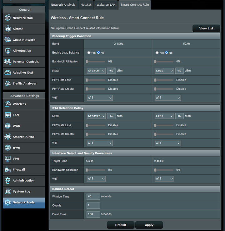 Lastly, we have the Network Tools section, which includes the Network Analysis, Netstat, Wake on LAN, and Smart Connect Rule tabs. The above screenshot for the Smart Connect Rule tab is where you can fine-tune how the router automatically steers clients to the most appropriate wireless band.