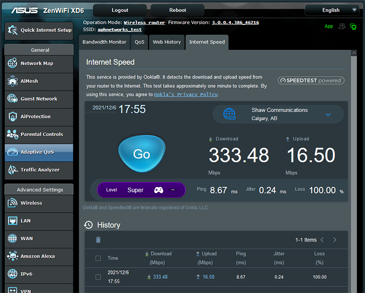 The Adaptive QoS section deals primarily with your internet performance for your local network. There are four subsections, as shown in our screenshot above. These include Bandwidth Monitor, which has live graphs showing the total bandwidth usage for the entire network as well as utilization by individual clients. QoS has options for adaptive QoS, traditional QoS, and bandwidth limiter. Web history shows what websites connected devices have visited. Internet speed, which is in the screenshot above, is where you can run a speed test.