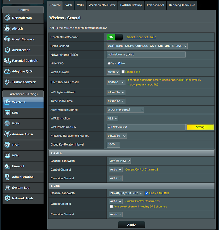 The Wireless section is where wireless settings are configured. The above screenshot shows all the options for the General tab, where standard Wi-Fi settings such as SSID, wireless mode, encryption settings, and channel settings can be customized. Other tabs include WPS or Wi-Fi Protected Setup, WDS or Wireless Distribution System, Wireless MAC Filter, RADIUS Setting, Professional, and Roaming Block List. Other than Professional, all of them should be self-explanatory.