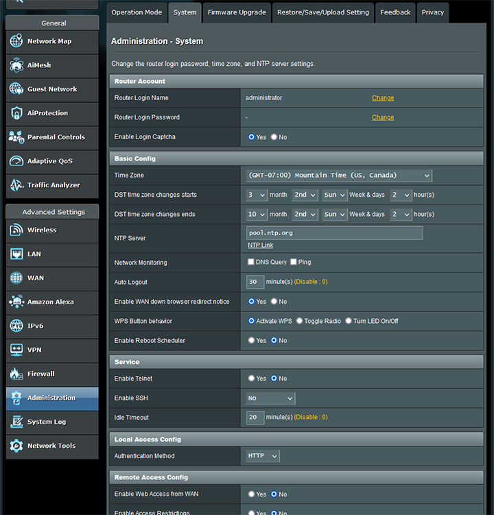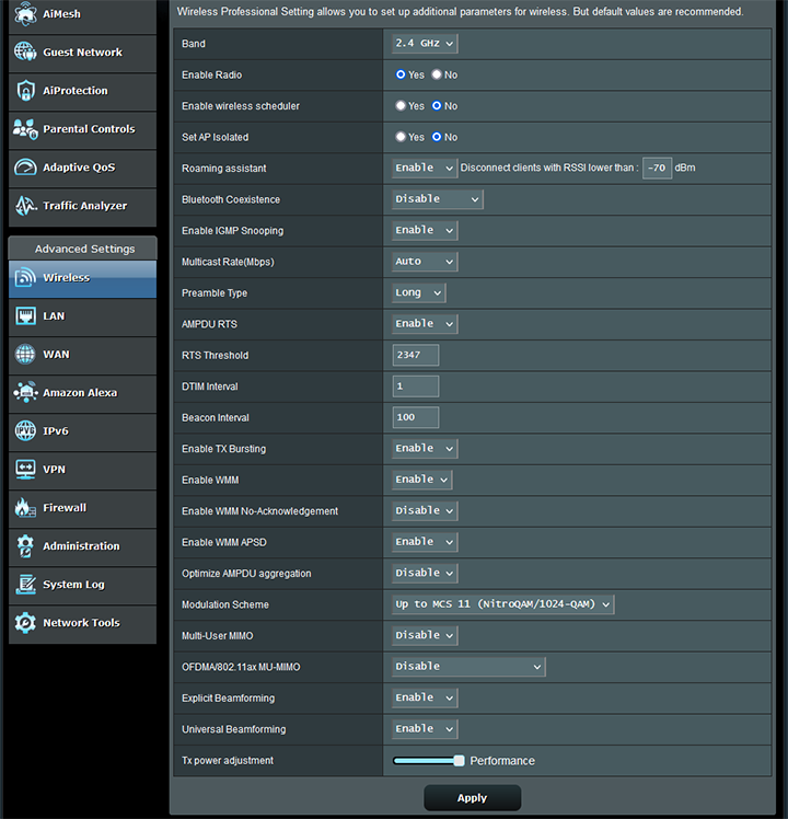 For the nerds among us, the Professional tab under the Wireless section is quite interesting, as shown in the screenshot above. Some of these options include modulation scheme, transmit power adjustment, explicit beamforming, and universal beamforming. A lot of these options are not commonly found in consumer-grade firmware, so I am happy to see them for those who are inclined to tinker with them.