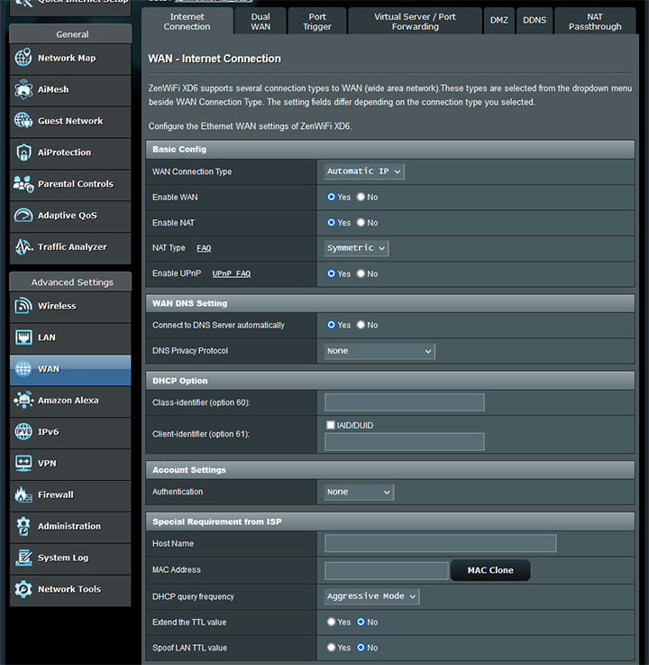 The WAN section allows you to configure how your router interacts with your internet service provider. The above screenshot shows the Internet Connection tab. Other tabs include Dual WAN, Port Trigger, Virtual Server/Port Forwarding, DMZ, DDNS, and NAT Passthrough. ASUS provides their own DDNS service and can be configured directly from this user interface.