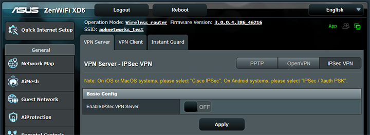 The next section I want to highlight is the VPN section. The VPN section has VPN Server, VPN Client, and Instant Guard tabs. The ZenWiFi XD6 has native support to be PPTP, OpenVPN, and IPSec VPN servers, shown in the above screenshot. VPN Client allows you to connect your entire network to a VPN server on a router level. Instant Guard allows you to monitor who is connected to the VPN server on the router, which can be created using the ASUS Router App.
