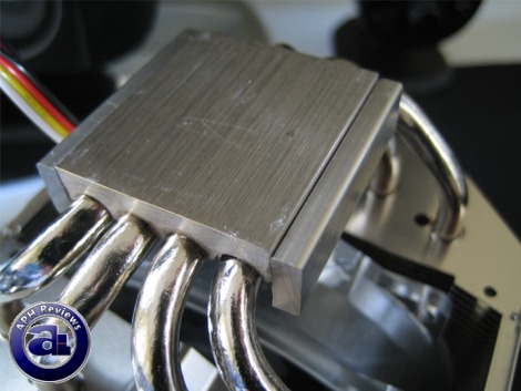 A closer look at the base of this heatsink. Asus claims that this is a copper base with four copper heatpipes; although, well, it is not the color of copper. Four heatpipes lead in both directions for a complete 'U' design.
