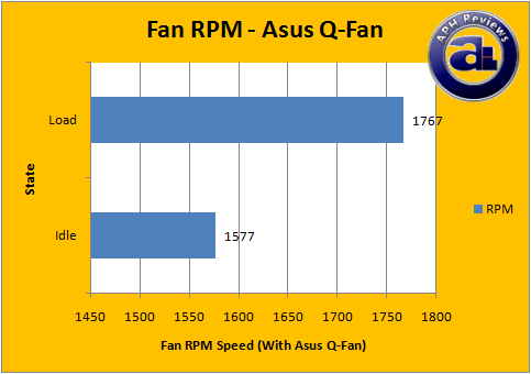 Idling temperature results were pretty good. Because of our low RPM fans inside our test system (I am a big fan of quiet computing), case temperature was roughly 37 to 38 degrees Celsius. At this rate, 5-6 degrees above case temperature is acceptable. Because we have Asus Q-Fan enabled on PWM/Silent Mode in the BIOS, the fan on the Asus Arctic Square moves at 1577 RPM +/- 5% idling -- therefore the result weren't bad.