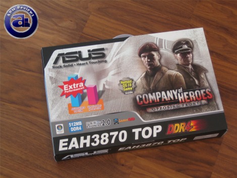 Our review unit of the Asus 3870 TOP was sent to us in its retail form; as usual from Asus. The cardboard box was large like the other graphics cards we've reviewed from Asus -- with a similar design scheme and identical box size; and this one features Company of Heroes: Opposing Fronts across the top along with the name of the graphics card. In this case, the Asus EAH3870 TOP comes with Company of Heroes: Opposing Fronts, a popular RTS game -- like the 8800GT TOP from the Asus as well.