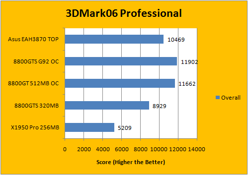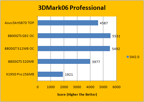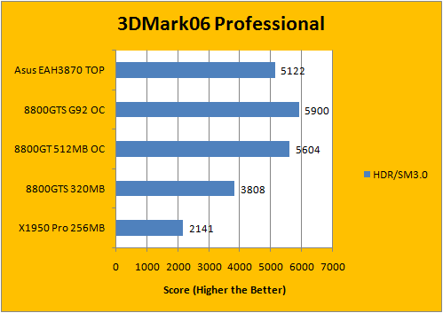 In 3DMark06 Professional, our Asus Extreme Radeon HD3870 TOP again did really well -- stepping in at roughly 10% lower score than the 8800GT and a few thousand points ahead of the 8800GTS G80. In SM2.0 and SM3.0/HDR tests, the factory overclocked Radeon was a few hundred points behind, but scores are still very decent in this Futuremark benchmark.