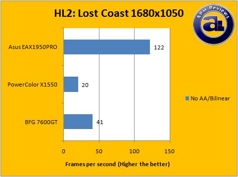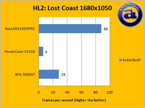 Using 6xAA and 16xAF in Half-Life 2: Lost Coast in the APH custom timedemo, the Asus EAX1950PRO has an average frame rate of 76FPS.