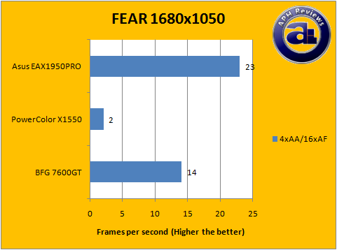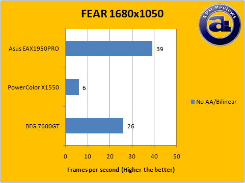 The Asus EAX1950PRO managed a 39FPS when AA is turned off and AF changed to Bilinear at 1680x1050.