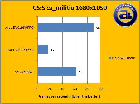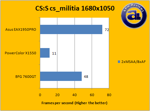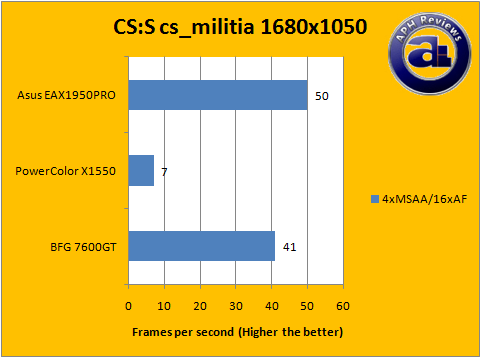 We benchmarked using a custom timedemo on map cs_militia. The reason why we did this is because cs_militia is a HDR map. With 4xMSAA and 16xAF, the Asus EAX1950PRO led at 50FPS.