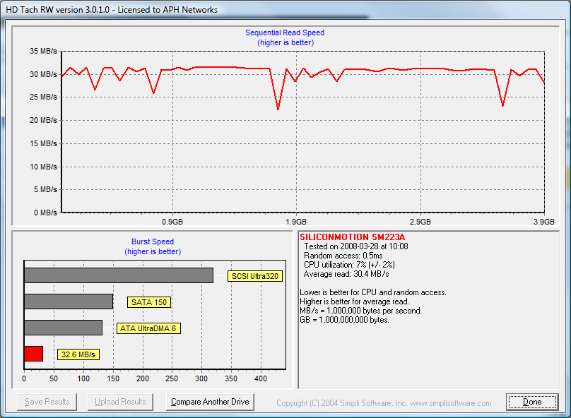 The Asus Eee PC uses an 4GB Silicon Motion SM223A flash SSD -- which performance generally very well in terms of operating system and program load times. Our HD Tach results show the Asus Eee PC's internal drive performance to obtain an average read speed of 30.4MB/s. While not necessarily impressive compared to even most PMR 5400RPM laptop hard disks, the latency is really good at 0.5ms random access.