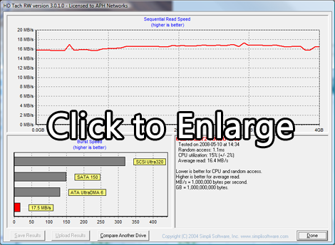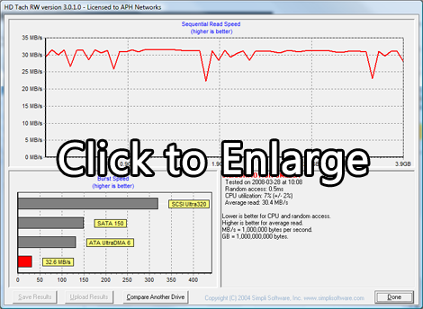 HD Tach will test the sequential read, random access and interface burst speeds of your attached storage device (hard drive, flash drive, removable drive, etc). All drive technologies such as SCSI, IDE/ATA, 1394, USB, SATA and RAID are supported. Test results from HD Tach can be used to confirm manufacturer specs, analyze your system for proper performance, and compare your performance with others. HD Tach is very easy to use, quick, and presents data in easy to read graphs, including the ability to compare two storage devices on screen at the same time for easy analysis.