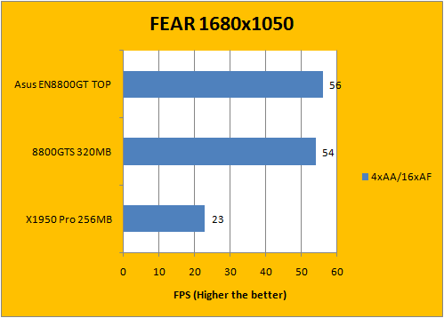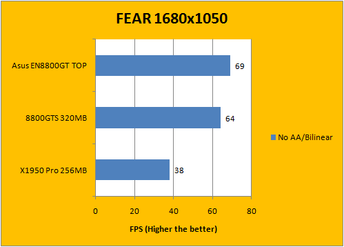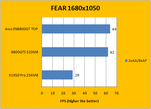 In our FEAR timedemo, results were pretty consistent. As usual, all settings were set to maximum and the only manipulated variables were AA and AF. 1680x1050 widescreen resolution is used to put more emphasis on the graphics card and less on the rest of the system. Soft Shadows were turned on; which is one of the more video card taxing settings in this game. Throughout the tests, we can see that the results are pretty consistent -- the Asus 8800GT was quite slightly better than the reference 8800GTS 320MB throughout the tests; and roughly twice as fast throughout compared to the reference ATI Radeon X1950 Pro.