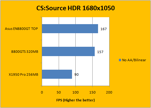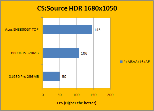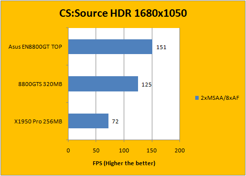 We've used the map cs_militia in our custom timedemo for HDR testing in Counter-Strike: Source. Using maximum settings once more and manipulating the AA and AF only, it goes as reflected upon our Half-Life 2: Lost Coast results -- the initial gap between the 8800GTS 320MB and the overclocked Asus 8800GT isn't much by an average of 10FPS. As we move up the ladder, however, the gap widens -- the bar representing the Asus 8800GT TOP was a load longer than any compared cards on the chart.