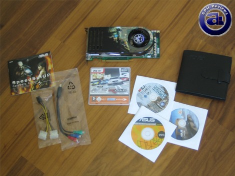 Out of the box, you will receive a HDTV-out cable, brief installation manual, leather CD case, and a dual Molex to 6-pin PCIe adapter in addition to the Asus EN8800GTS 320MB board itself. As far as the software bundle goes, Ghost Recon Advanced Warfighter, Race: The WTCC Game, 3DMark06 Professional, drivers and software CD, manual CD are also included. DVI to VGA adapters are supposed to be included; but I don't recall seeing any out of the box.