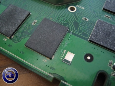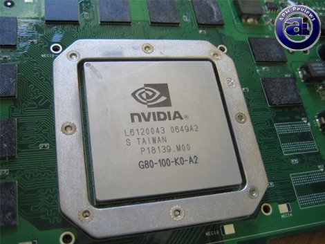 A shot at the heart of this video card -- the NVIDIA 8800GTS GPU. It's huge -- with the integrated heatspreader it is quite a bit larger than a Core 2 Duo CPU.