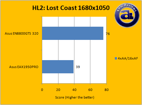 Our benchmarks for Half-Life 2: Lost Coast have been modified to stress the video card a little bit more. Since NVIDIA cards do not support 6xAA with this game (The setting can be enabled, but it won't work), 4xAA with 16xAF has been selected for this game. The Asus EN8800GTS 320MB was almost twice as powerful as the Asus EAX1950PRO.