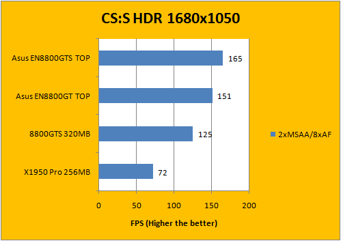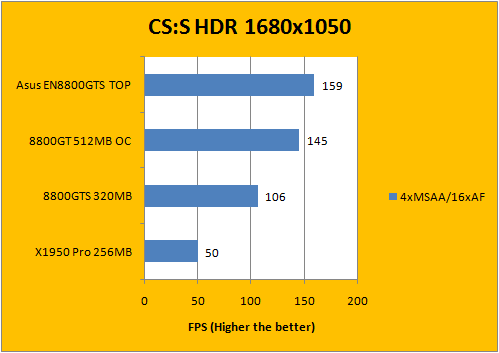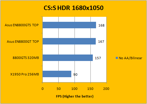 Again, similar results were posted with our custom timedemo in cs_militia, an HDR map in Counter-Strike: Source. The difference only widens as AA and AF are increased -- otherwise, it's quite close with AA off and AF on Bilinear. Using maximum settings once more and manipulating the AA and AF only, it goes as reflected upon our Half-Life 2: Lost Coast results in the previous page.