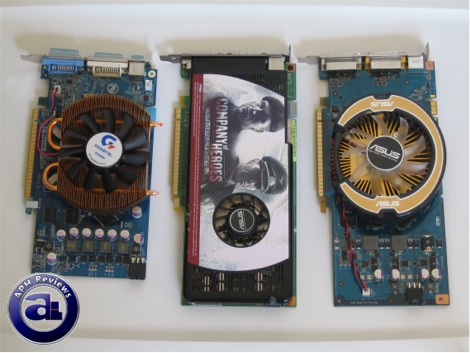 From the left is a Gigabyte GeForce 8800GT TurboForce 512MB, Asus EN8800GT TOP 512MB, and finally the Asus EN9600GT TOP 512MB we are reviewing today. While the Gigabyte card uses a shorter non-reference design, the 9600GT offered by Asus is 23cm in length -- standard for many of today's video cards, like the Asus 8800GT. The Asus 9600GT TOP is built on a blue colored PCB with Asus' own Glaciator aluminum heatsink/fan, which blows air directly over GPU cooling fins -- as well as bringing airflow over nearby components such as RAM and VRMs (But does not necessarily cool them directly). The heatsink will occupy one slot below the PCIe slot the card is connected to.