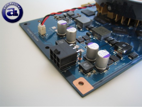 At the opposite end of the board is the 6-pin PCIe connector, facing outwards towards your hard drive cage if installed in a standard environment. This is what I like: It's slid a bit inwards instead of being placed right at the edge of the PCB. This would make cabling a bit neater looking.