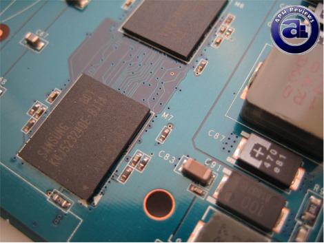 The Asus 9600GT TOP's memory chips are fully exposed as they aren't cooled directly by a heatsink. They use Samsung K4J52324QE chips, which runs at 1000MHz (2000MHz effective) according to the datasheet on Samsung's website. A standard NVIDIA 9600GT's RAM runs at 900MHz, so Asus didn't necessarily overclock the memory on the 9600GT TOP before shipping -- 1000MHz is stock for the onboard chips. We'll see how it overclocks shortly.