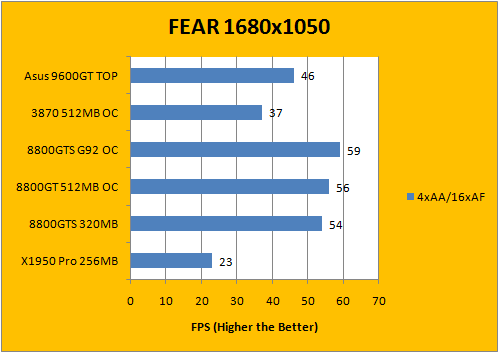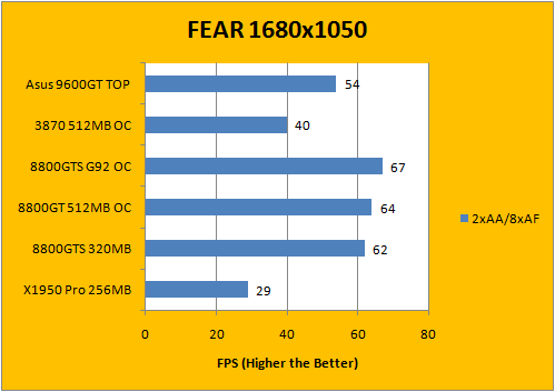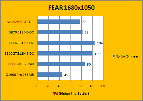 As usual, our first test that comes along in our standard benchmark set is FEAR. All settings were set to maximum and the only manipulated variables were AA and AF. 1680x1050 widescreen resolution is used to put more emphasis on the graphics card and less on the rest of the system. Soft Shadows were turned on; which is one of the more video card taxing settings in this game. Like the 3870, the 9600GT TOP performed relatively poorly against the bunch with AA and AF turned on -- but still managed to outperform the factory overclocked ATI Radeon HD 3870 by a good margin. In the no AA/AF test, however, the 3870 overtook the 9600GT in our benchmarks.