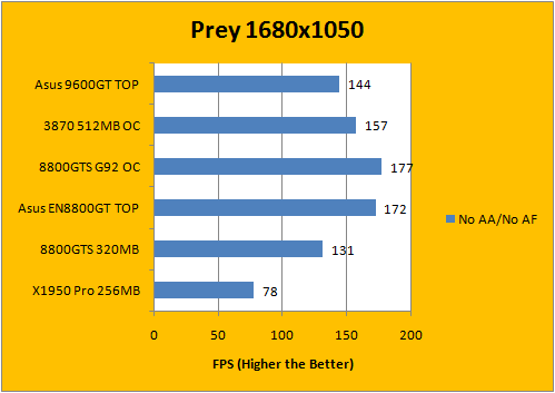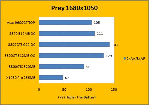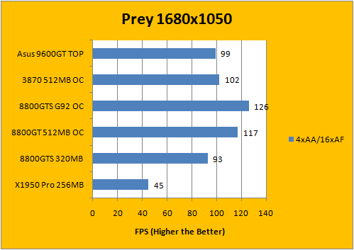 Using our own custom timedemo run in Prey, we've used the com_fixedtic 1 command to remove the 30fps frame cap on by default on this Quake 4 engine based game. The ATI video card performed very well in this segment as we've mentioned in our 3870 review previously; and the 9600GT scored right below the 3870 in all three tests -- high AA/AF, mid AA/AF, and no AA/AF.