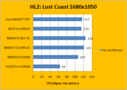 The Source engine based Half-Life 2: Lost Coast with HDR implementation as well as complex facial texture rendering may be somewhat be seen as an ATI game, but let's put it this way -- the 9600GT TOP topped the 3870 TOP (No pun intended) in all three tests. It may be surprising, but the 9600GT scored above it. It's still no match for the Asus factory overclocked 8800GT, as shown in all of our previous benchmarks.