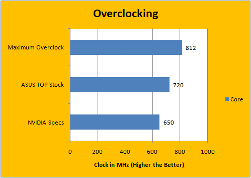 At stock, the 9600GT core operates at 650MHz -- and Asus pulled it to a somewhat (But not overly) aggressive 720MHz. That's a 11% overclock out of the box. I managed to run it at 812MHz stable, which translates it to an impressive 25% overclock from stock or 13% increase from pre-overclocked speeds. The 162MHz/92MHz increase from each reference point, respectively, is quite impressive -- from my research even cream of the crop 9600GT cards maxes up in the early to mid 800MHz range.