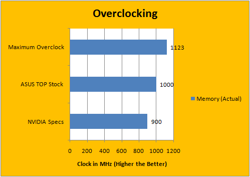 The maximum overclock I was able to attain on the Asus 9600GT TOP was 1123MHz (2246MHz effective), from the Asus stock speed of 1000MHz -- essentially a 12% overclock and again, 25% faster than a generic 9600GT card. The memory themselves are actually rated at 1GHz. Generally speaking, you can expect the Asus 9600GT TOP to be 25% faster than a stock 9600GT in all areas -- whether it be the core, shader, or memory speed.