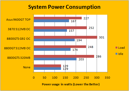The G94 core is actually very power efficient, as we can see from our charts above. Please note that the load conditions cannot be measured against no graphics card since the entire system is under load, and as such the CPU which will not limit to only graphics card power consumption. However, these figures are accurate against each other besides the 'None' value as 129W as a place filler. With that in mind, the 9600GT's power consumption reached a maximum of 227W from 167W -- which is pretty good. It's quite a bit less than the G92 8800GT, and in load conditions it's much better than the 3870 as well. The only difference is that the 3870 has ATI PowerPlay for dynamic speed and voltage adjustment for the card idling, and this reflects in the power consumption chart above.