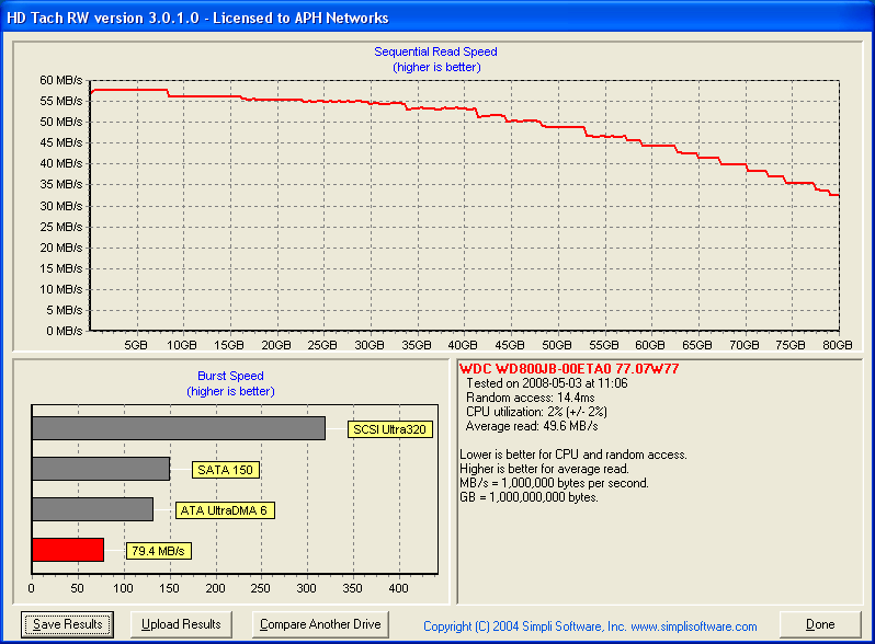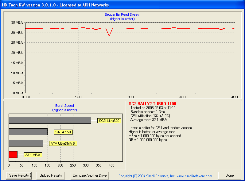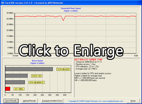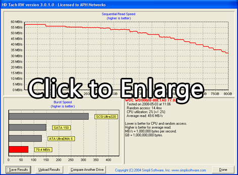 HD Tach will test the sequential read, random access and interface burst speeds of your attached storage device (hard drive, flash drive, removable drive, etc). All drive technologies such as SCSI, IDE/ATA, 1394, USB, SATA and RAID are supported. Test results from HD Tach can be used to confirm manufacturer specs, analyze your system for proper performance, and compare your performance with others. HD Tach is very easy to use, quick, and presents data in easy to read graphs, including the ability to compare two storage devices on screen at the same time for easy analysis.
