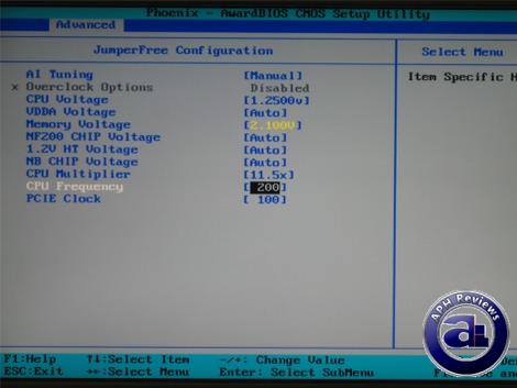 The JumperFree configuration page allows voltage and CPU clock adjustments, as shown above. The CPU voltage range is quite adequate; with the memory controller voltage adjusted independently with the VDDA voltage setting.