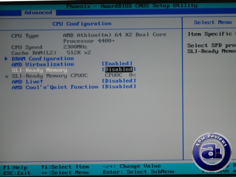 The CPU configuration page to toggle settings such as AMD Live! and the Cool & Quiet function. To access the RAM configuration page, you'll have to pass through the CPU configuration screen -- it was a bit confusing initially because on Intel platforms they are usually in the JumperFree Configuration screen -- but recalling into the good old days of my K8V board, it's exactly the same thing haha.