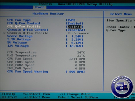The Hardware Monitoring page. Nothing too special here; it's basic information such as voltages, fan speeds, and temperatures. As usual from Asus boards, motherboard fan controller preferences can be defined by the options on this page.