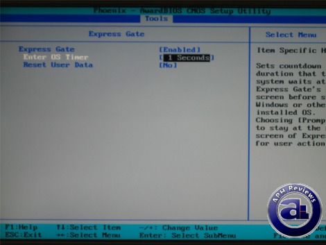 Configuration for Asus' Express Gate onboard Linux based OS can be set to enabled or disabled; along with timeout during bootup. Data clearing/reset for Express Gate can also be done on this screen.