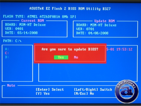 As usual with Asus motherboards, the Asus M3N-HT Deluxe features Asus' EZ Flash BIOS update utility. This allows flashing without a floppy or the problems of Windows utility flashing. I experienced no problems updating with the ROM file stored on a USB flash drive.